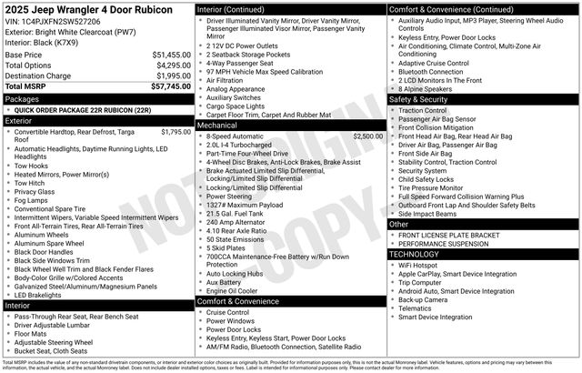 Whether you're tackling the wilderness or navigating the urban landscape, the 2025 Jeep Wrangler Rubicon is the ultimate expression of rugged capability and refined sophistication. With an EPA-estimated 20 city/22 highway MPG, this Wrangler Rubicon offers the perfect balance of power and efficiency to meet your diverse driving needs.